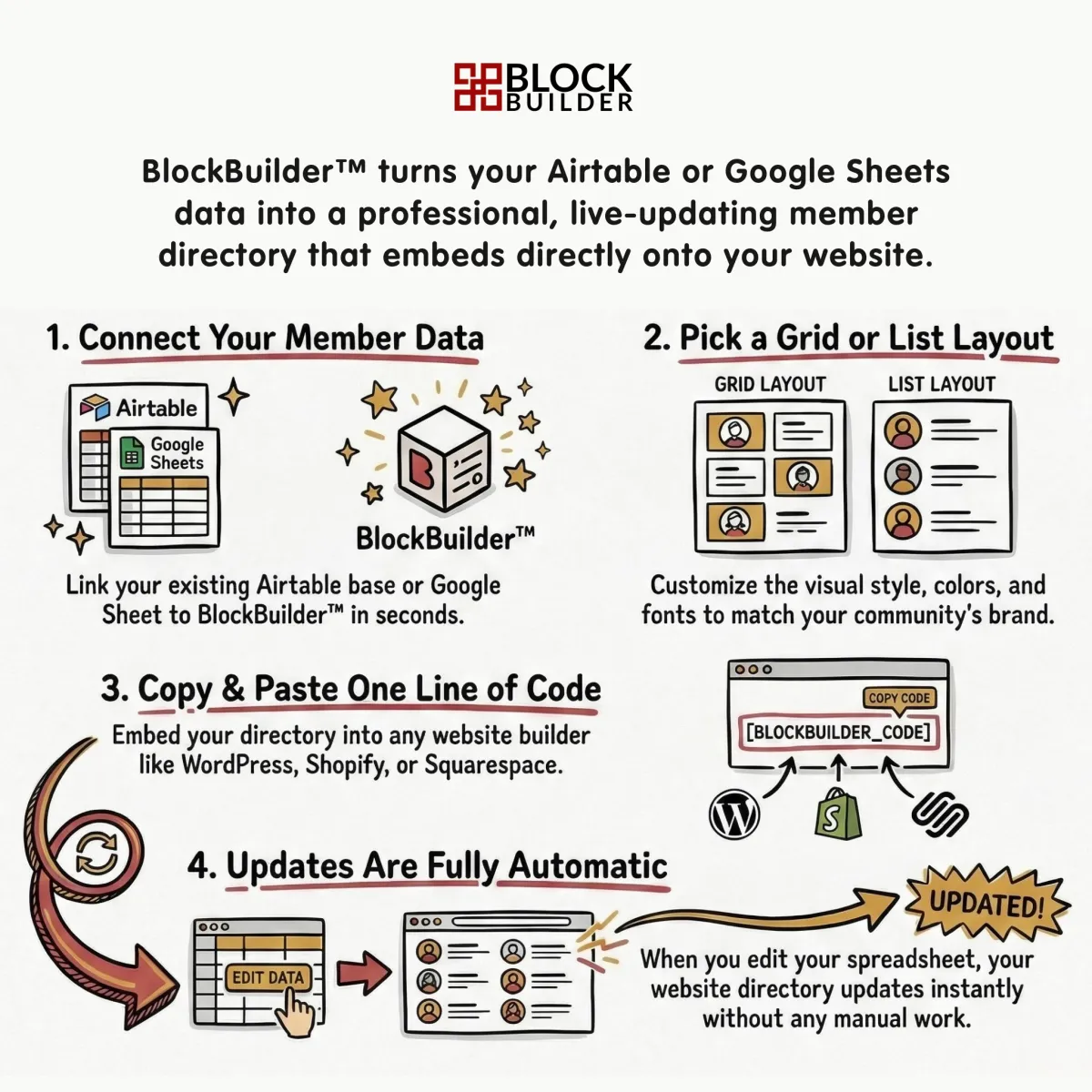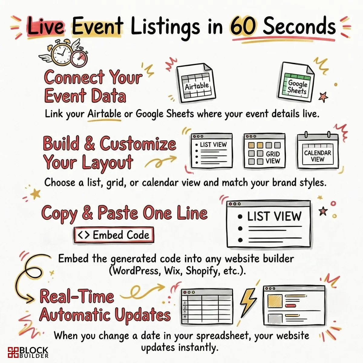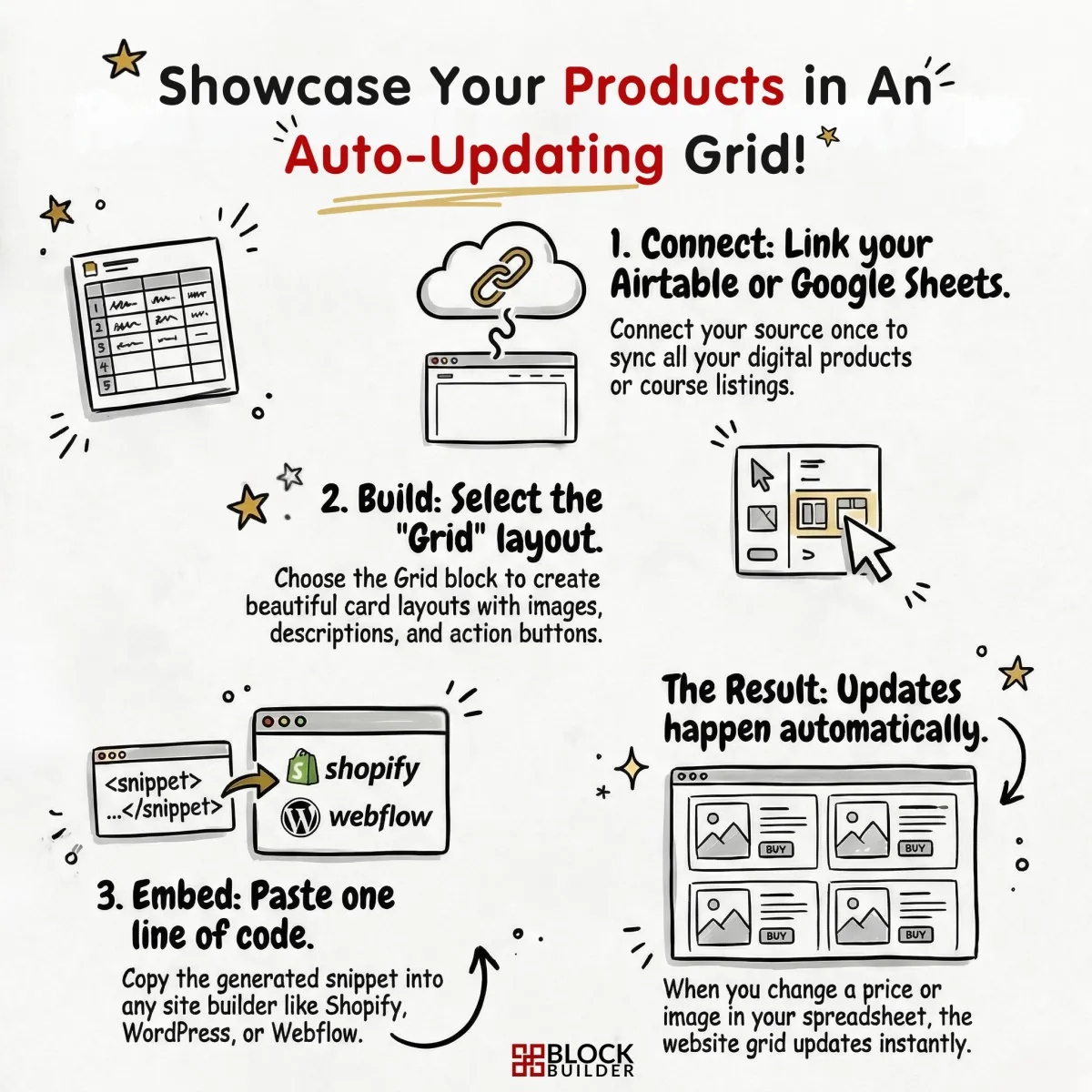 It's automatic! 🎉BlockBuilder™ turns your Airtable or Google Sheets data into live blocks you can embed onto unlimited pages and emails — without building a full app.