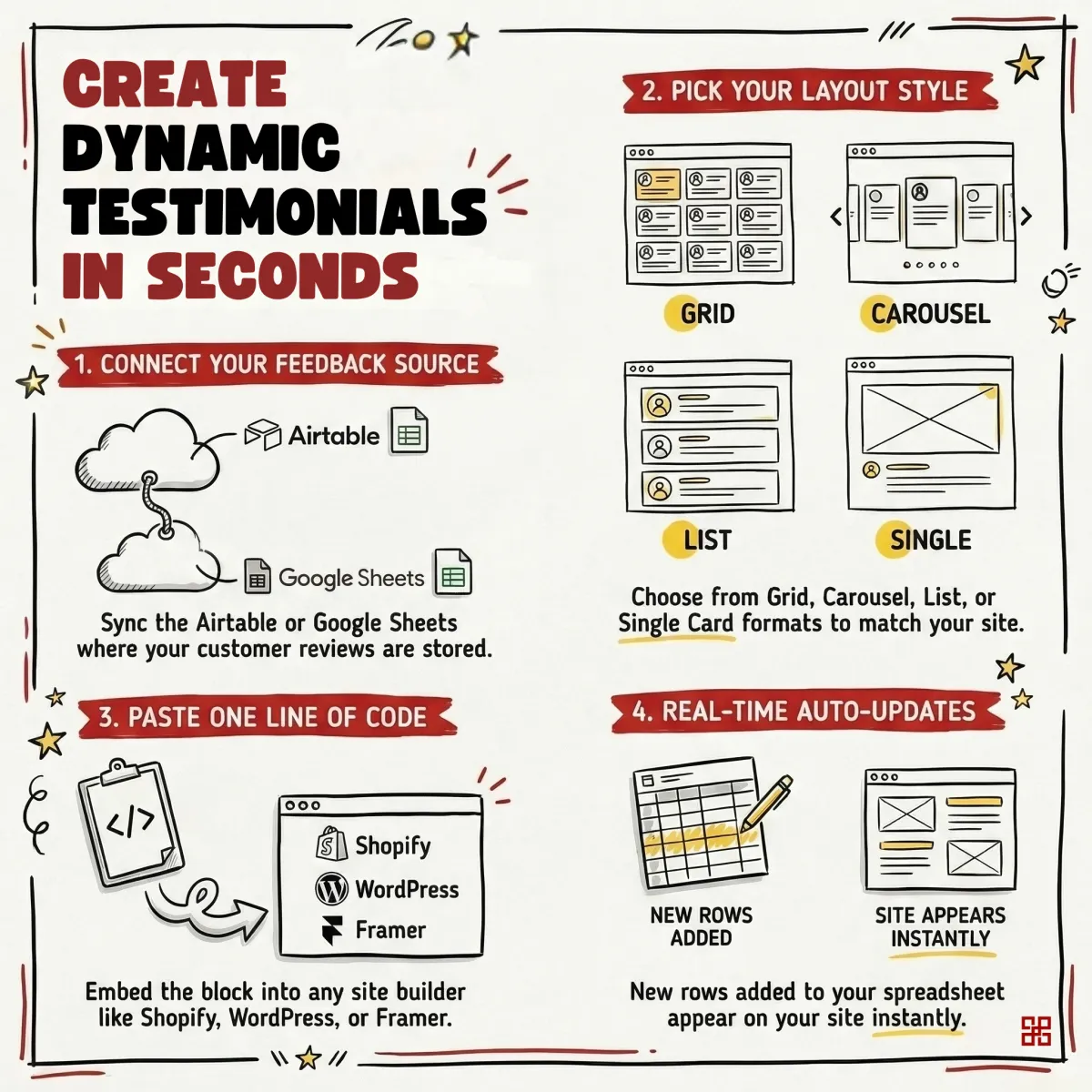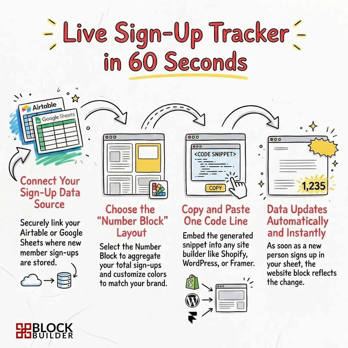 Link your Airtable base or Google Sheet. Your spreadsheet becomes the live data source behind your block — no manual updates ever.
