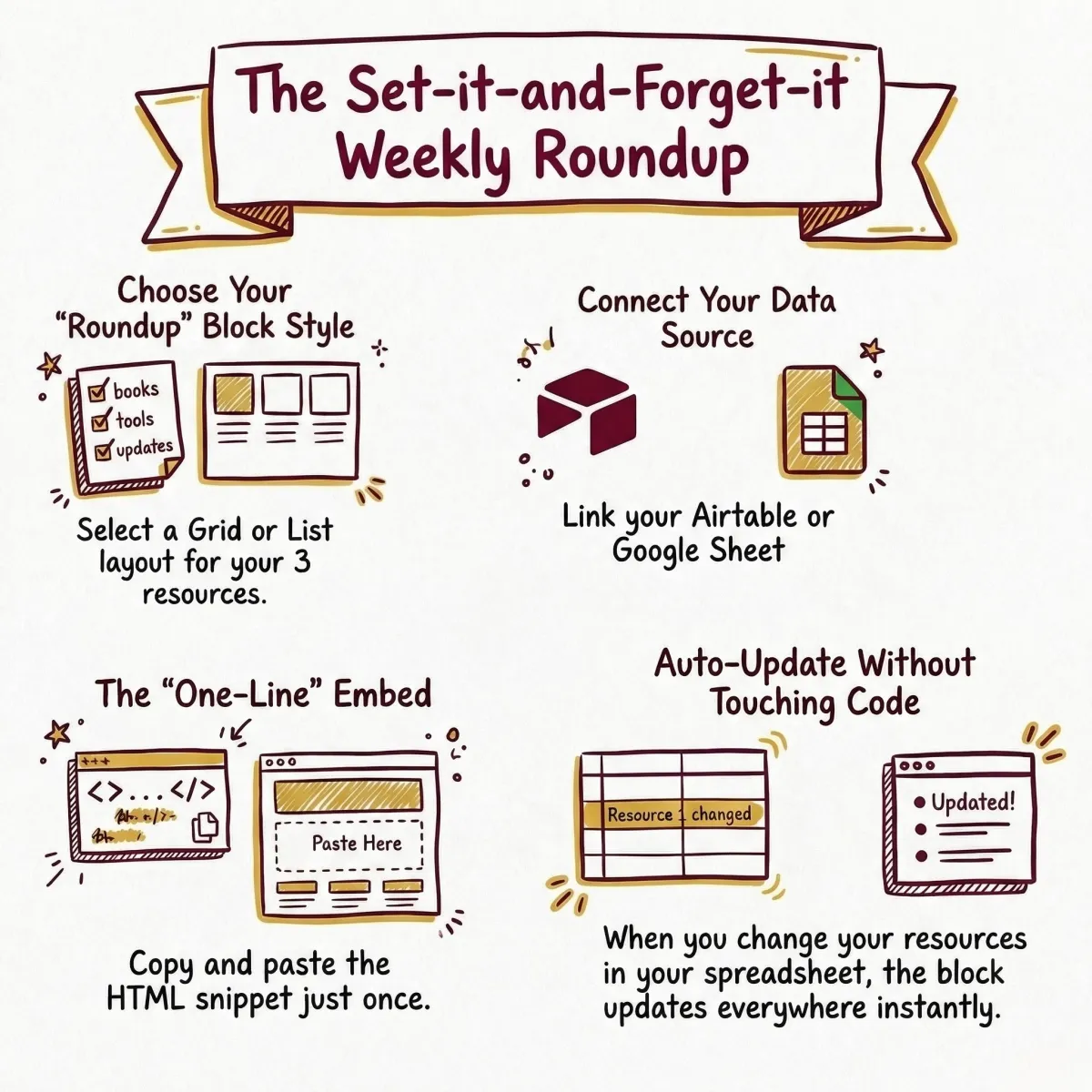 No CSS needed ✌️Copy one small snippet and paste it into your website or email builder. Your block goes live instantly and updates automatically whenever your data changes.